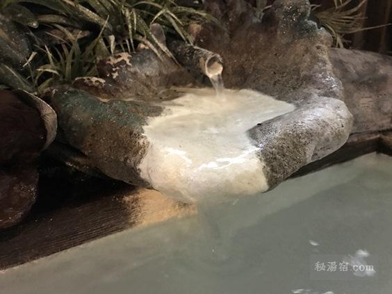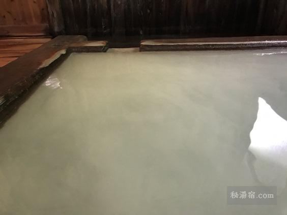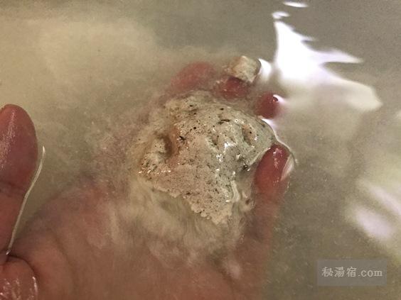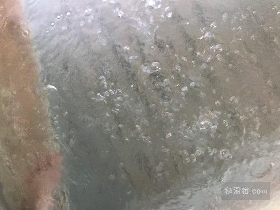 お湯はほぼ透明ですが、底の方にわずかに湯花が沈殿しています。
