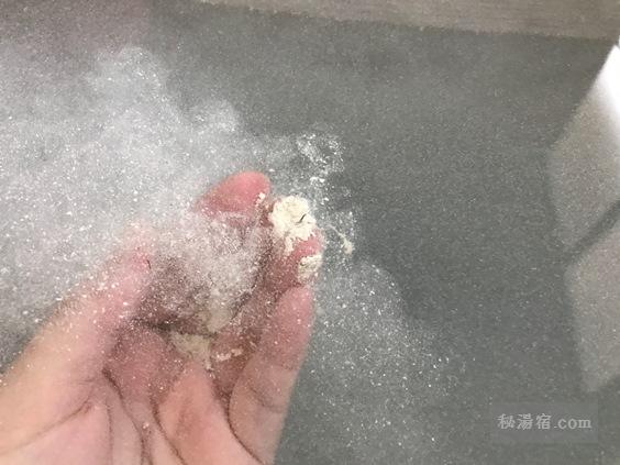 湯舟の底をさらってみると、ちょっとしたパックが出来そうなくらいパウダー状の黄色い湯花が沈殿していました。