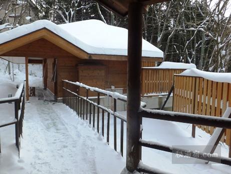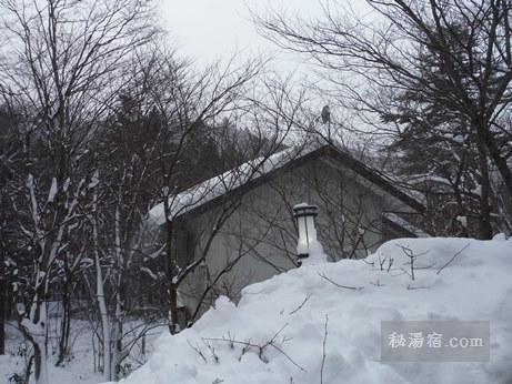 露天風呂から見た内湯の建物。ツララが凄いです。