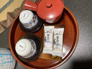 お部屋は純和室。布団は食事の時に上げ下げするシステム。お茶請けは雷鳥の里。他の方が挙げていますが、部屋のトイレはウォシュレット。共用のトイレにも一部ウォシュレットです。
