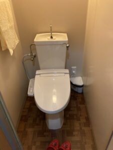脱衣所には棚と洗面台、ベビーベッドがありました。