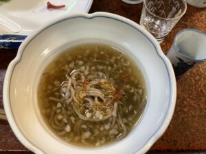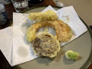 天ぷらは食べてしまったものも含め、山うど、白舞茸、シイタケ、鮎の稚魚、かぼちゃ。蕎麦はとろみのある餡に蕎麦の実が。