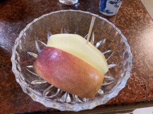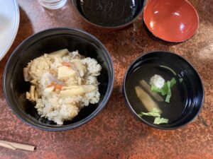 たけのこ御飯、お吸い物、水物はシナノスイートかな?。