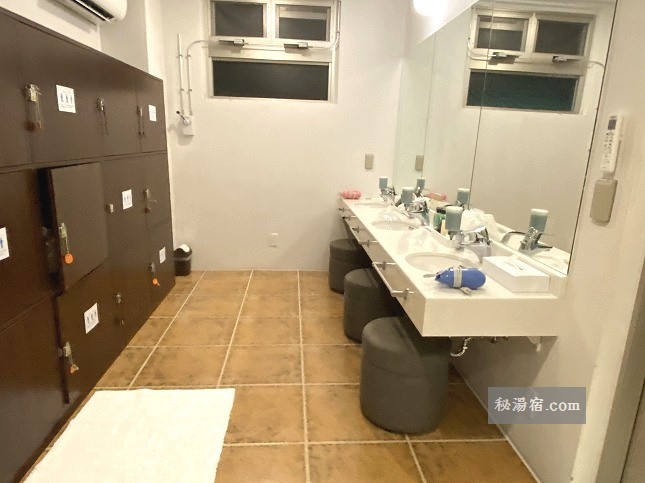脱衣所にはロッカーと広い洗面台、ドライヤーあり