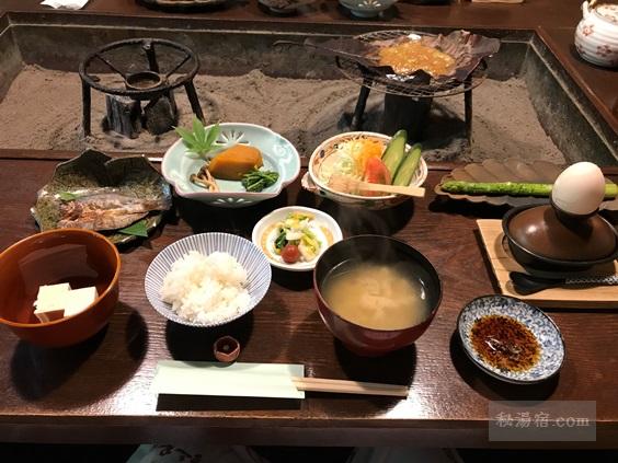「藤助の湯 ふじや」の食事は夕食・朝食ともに1階ロビーの奥にある個室の囲炉裏席になります。