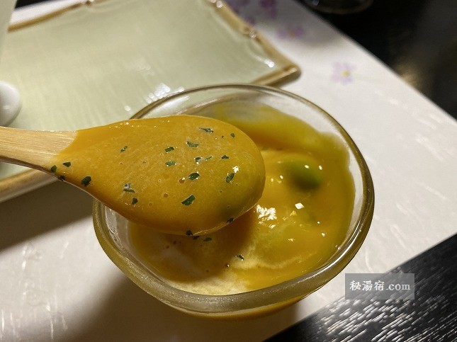 かぼちゃの冷製スープの中に枝豆が入っています。