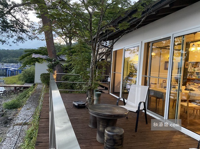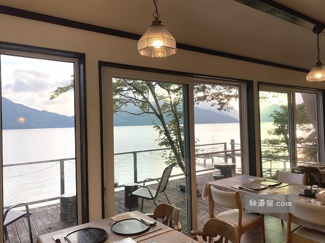 「ホテル湖上苑」の食事は1階にある湖畔のレストラン(テーブル席)となります。