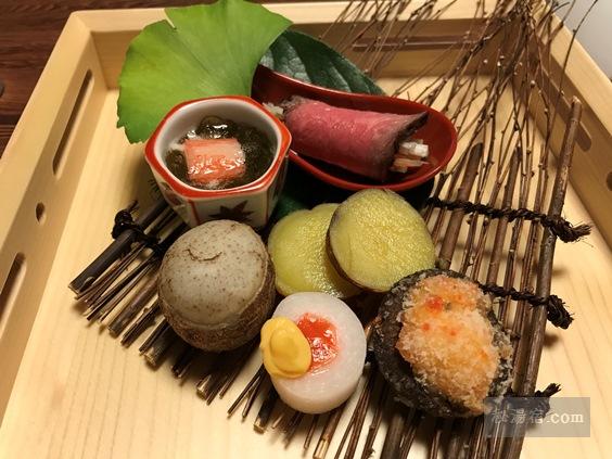 左手前から、里芋、サーモンの大根なます巻き、しいたけと魚のはさみ揚げ、サツマイモの甘露煮、めかぶとカニ肉ローストビーフ。