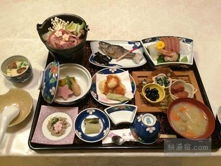 こちらは夕食。鍋物あり、刺身に岩魚の塩焼き、煮物、茶碗蒸しなど。