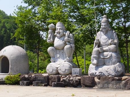 横手の冬の名物かまくらを模した石像に、巨大な大黒様と恵比寿様の像。