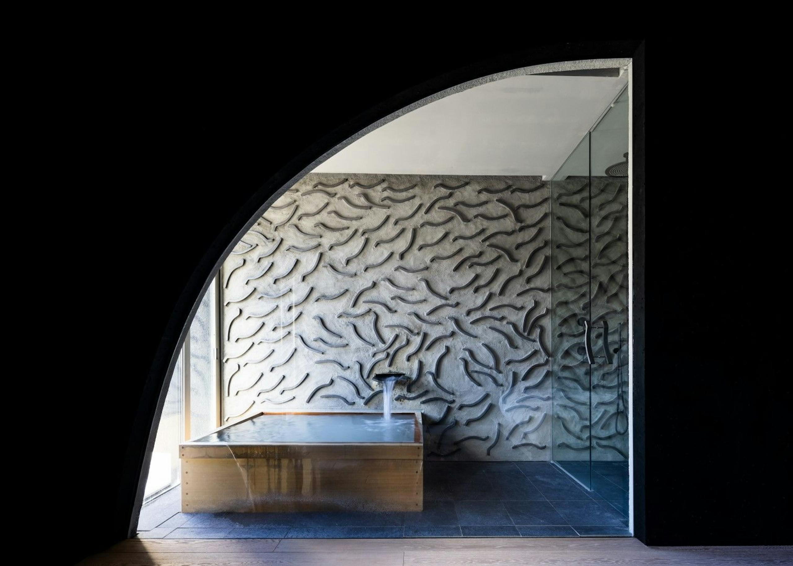 壁のうねうねしたデザインは湯畑の敷石と同じ。