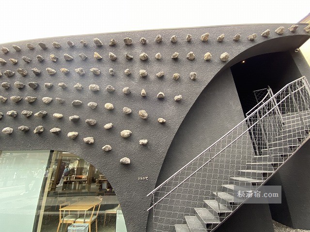壁のうねうねしたデザインは湯畑の敷石と同じ。