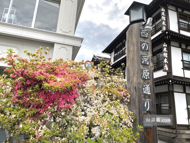 「山本館」は湯畑目の前!北側にある西の河原通りに入って玄関まで25mという近さ(笑)