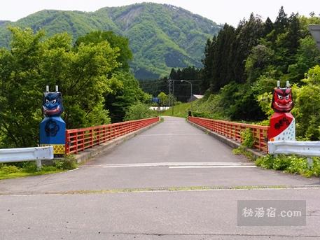 鬼首温泉入口にある赤鬼、青鬼の橋。とどろき旅館の看板。