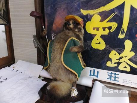 帳場の前にはゴルフのキャディさんの格好をしたたぬき。