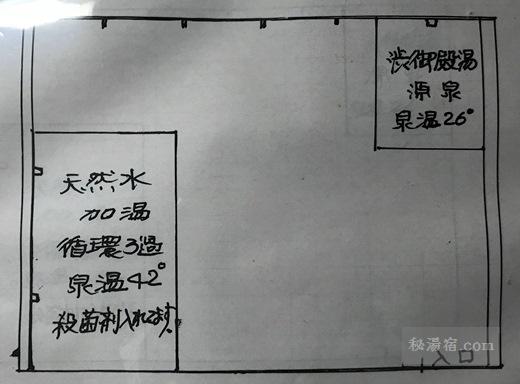 - 西館に男女別の内湯(渋御殿湯源泉:冷泉各1、湧水の沸かし湯各1)