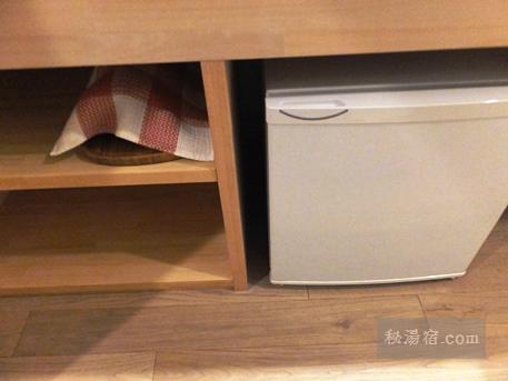 空のミニ冷蔵庫と電気ポット、冷水ポット、お茶セット(緑茶のティーバッグ)。