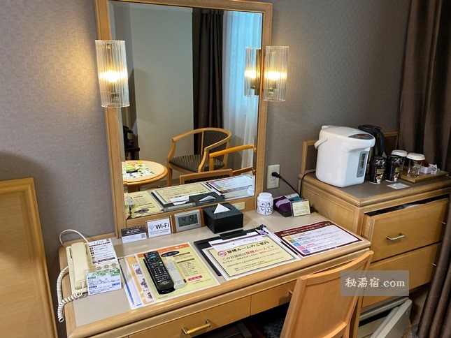 ハリウッドツインの客室は20㎡でトイレ・バス付、テレビ、ミニ冷蔵庫、ポット、空気清浄機、金庫があります。