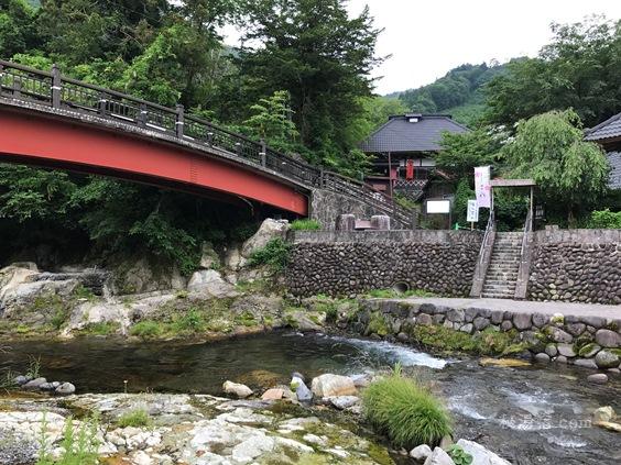 人が歩いている奥に見える階段が「湯銭橋」、橋の入口すぐ左側に公衆浴場「薬師の湯」、橋を渡った左側には「薬研の湯」という「金井旅館」が所有する野湯もあります。