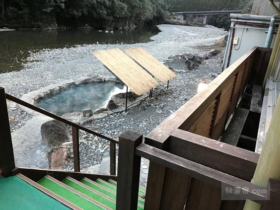隣の「きのくに」は閉館後2011年に浦島グループが再建して営業していましたが、2015年5月から閉館中のようです。もう1軒奥には同グループの「川湯まつや」もあるので、供給過多になってしまったのか。それとも老朽化したのか、川沿いの露天風呂の跡はそのまま残っていました。
