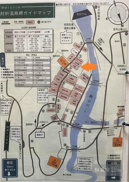 「西本屋旅館」の場所はオレンジの矢印の部分。左隣は日本秘湯を守る会の「丸屋」、斜め向かいは「上の湯」です。