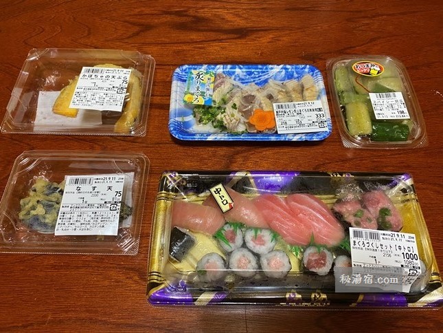 この日、宿泊する「石部温泉 いでゆ荘」は素泊まり専用宿なのですが、車で15分くらい離れた松崎町まで出ないと食事の場所がないので、スーパーでお刺身やお寿司等を買って帰ることにしました。