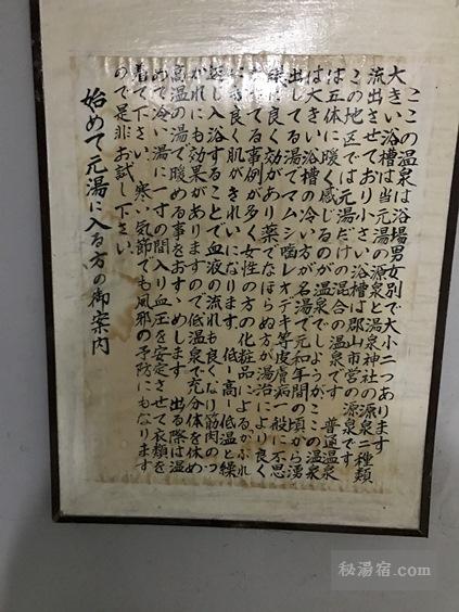 江戸時代初期・元和年間(1615年から1624年)から湧出している名湯。マムシにかまれた時やおでき等の皮膚疾患に良いとされ、薬では治らなかった人もこの温泉で湯治すると治ったとか。女性には美肌効果、交互浴で血行を良くし、血圧を安定させ、風邪予防にもなる、等と書かれています。