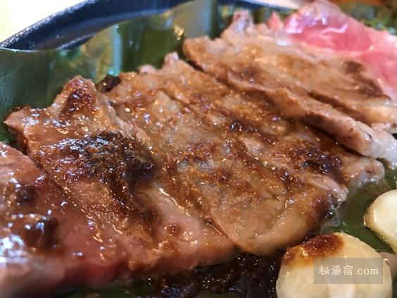 朴葉が敷いてあるのでジュウジュウ音がしないなぁと待っていると、あまり焼きすぎないうちに食べてくださいと言われ裏返すとミディアムレアに焼けていました。