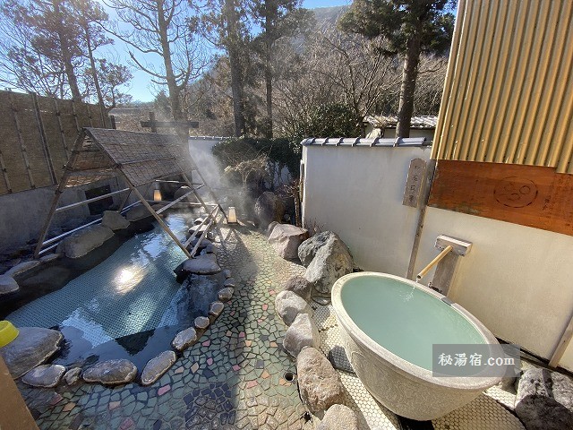 このうち、自家源泉の硫黄泉と引き湯の重曹泉を源泉かけ流し(冬季加温あり)で堪能できる貸切風呂「正徳の湯」が名物になっています。
