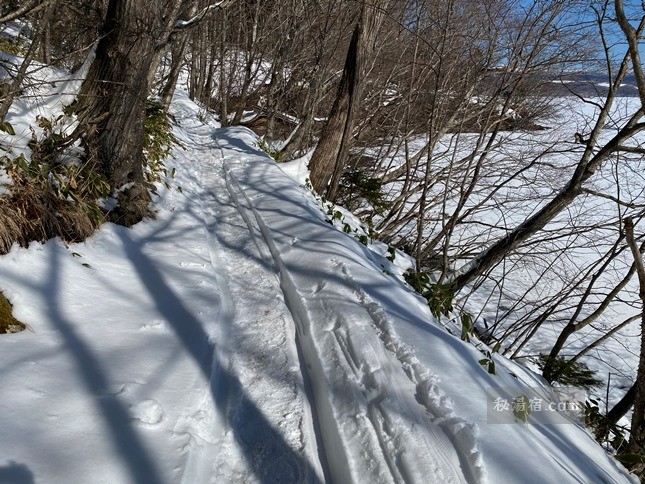 歩いた跡があるのが自然探索路。右側の真っ白い部分は凍っている屈斜路湖です。