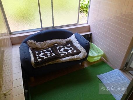 ドアには「入浴中」の札があり、中は洗面台とソファのある簡易な脱衣所になっています。