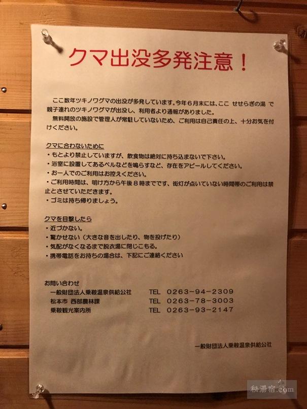 再訪時にはクマ出没の看板が出ていて驚いたのですが、2017年6月頃、湯小屋の前に親子熊が出て一時は閉鎖されたそうです。