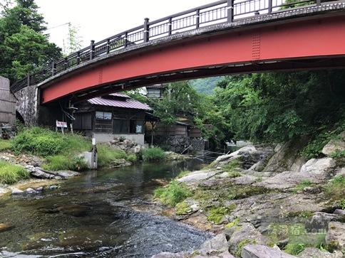 湯西川温泉街を流れる湯西川。温泉街の中央にかかる赤い橋のたもとに「共同浴場 薬師の湯」はあります。