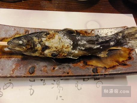 焼きたての岩魚の塩焼きを冷めないように囲炉裏に刺して、好きなタイミングでいただきます。