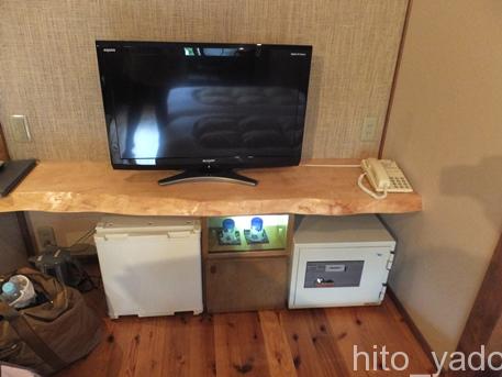 大き目の液晶テレビとからの小さな冷蔵庫、お茶セット、グラスセット、金庫、電話