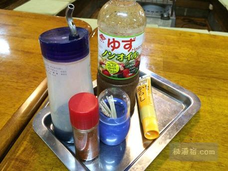 テーブルにはドレッシング、醤油、一味唐辛子、辛子と調味料が揃っています。