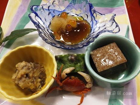 前菜:沢蟹(中央)、えごまどうふ(右)、あけびと茸の味噌炒め(左)
