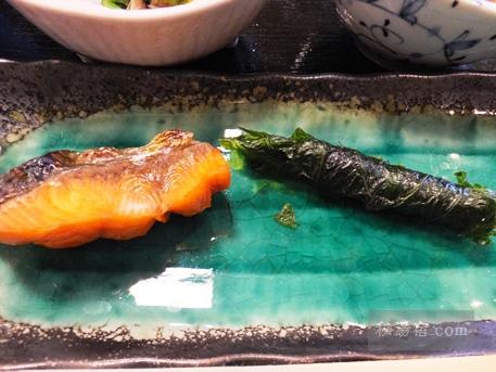 ハム入りサラダ(和風ドレッシング)、焼き鮭と味噌しそ巻