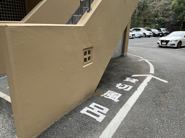 アスファルトの駐車場に「貸切風呂」と書いてあるのでそのまま進行方向に進みます。